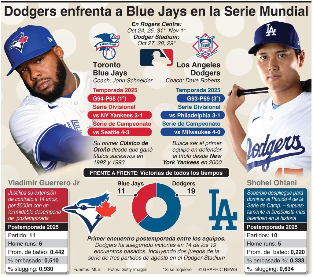 La Serie Mundial cuatro de siete del Béisbol de las Grandes Ligas (MLB) enfrenta a Los Angeles Dodgers, en su quinta aparición en ocho años en el Clásico de Otoño, contra Toronto Blue Jays, que llega a su primer gran evento MLB desde que ganó títulos sucesivos en 1992 y 1993.