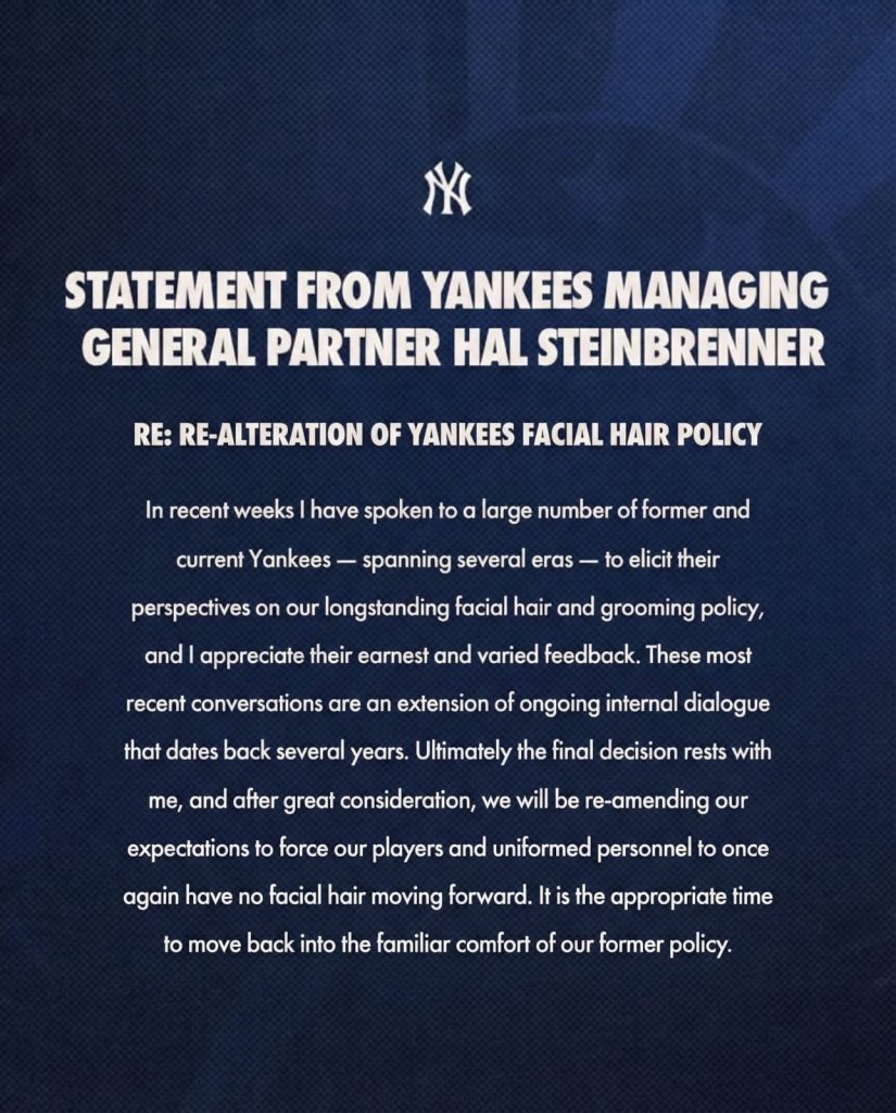 “Después de una gran consideración, estaremos re-enmiendando nuestras expectativas para que nuestros jugadores y personal uniformado vuelvan a no tener vello facial”, expresó Steinbrenner en un comunicado. “Es el momento adecuado para regresar a la comodidad de nuestra política previa”.