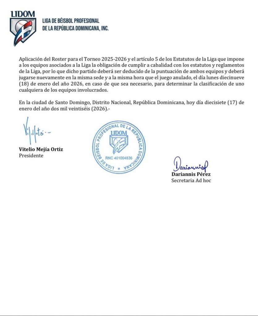 La presidencia de la Liga de Béisbol Profesional de la República Dominicana, Inc. (Lidom) hace de público conocimiento lo siguiente: