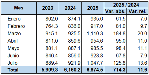 Particularmente, el mes de julio registró un valor de remesas de US$1,047.7 millones, con un aumento de US$125.8 millones (13.6 %) comparado con el mismo mes de 2024 y US$123.9 millones (13.4 %) respecto a junio de 2025