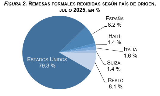 El BCRD destaca también la recepción de remesas por canales formales desde otros países en el mes de julio, como España, por un valor de US$78.4 millones, un 8.2 % del total, siendo este el segundo país en cuanto al total de residentes de la diáspora dominicana en el exterior se refiere, así como Italia con una participación de 1.6 %, Haití y Suiza, con una participación del 1.4 % de los flujos recibidos. En el resto de la recepción de remesas se distinguen países como Canadá y Francia, entre otros.
