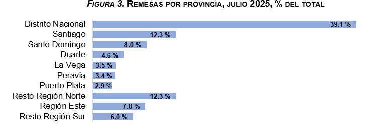 Con respecto a la distribución de las remesas recibidas por provincias, el BCRD señala que el Distrito Nacional recibió una proporción del 39.1 % durante julio, seguido por las provincias de Santiago y Santo Domingo, con un 12.3 % y 8.0 %, respectivamente. Esto indica que más de la mitad (59.4 %) de las remesas se recibe en las zonas metropolitanas del país.