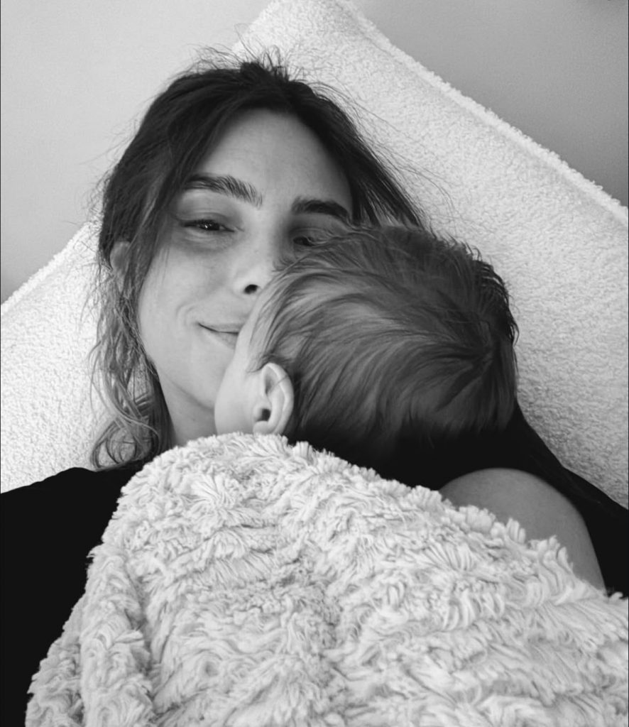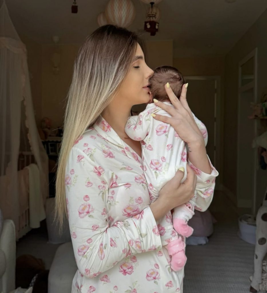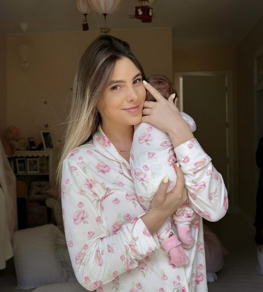 En la fotografía publicada en Instagram, Pons aparece vistiendo un pijama floral a juego con el de la bebé, mientras la sostiene en brazos.