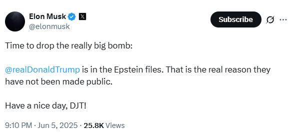 Además, el empresario sugirió liberar la “verdadera bomba”. Por ello, los archivos secretos de Epstein siguen ocultos, según Musk, Trump aparecería en ellos.