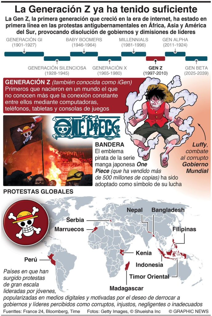 El emblema de las llamadas protestas de “Gen Z” es el motivo de la bandera pirata de la serie de manga japonesa “One Piece” (que ha vendido más de 500 millones de copias), con un protagonista llamado Luffy que lucha contra el corrupto Gobierno Mundial.