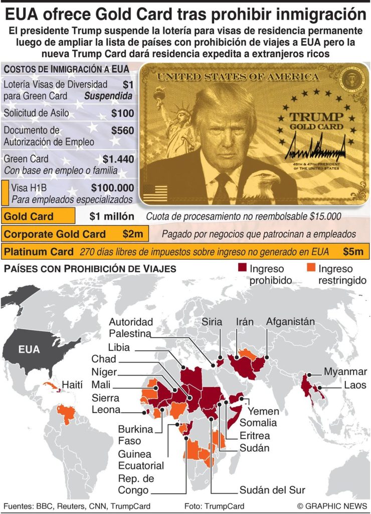El presidente Trump suspende la lotería para visas de residencia permanente, Green Card, luego de ampliar la lista de países con prohibición de viajes a EUA pero la nueva Trump Card dará residencia expedita a extranjeros ricos.