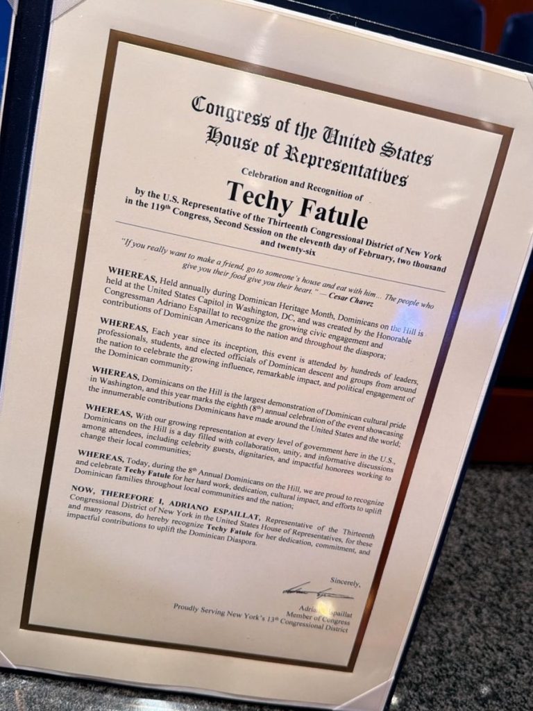 La artista y comunicadora dominicana Techy Fatule fue reconocida en el Congreso de los Estados Unidos, distinción que recibió con profundo agradecimiento y orgullo.