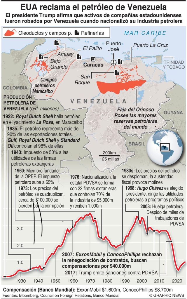 El presidente Trump afirma que activos de compañías estadounidenses fueron robados por Venezuela cuando nacionalizó su industria petrolera en 1976 y en una renegociación de contratos en 2007.