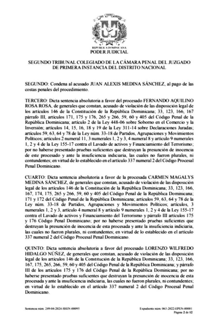 El Segundo Tribunal Colegiado del Distrito Nacional declaró culpable a Juan Alexis Medina Sánchez por una amplia lista de delitos: uso de documentos falsos, asociación de malhechores, estafa contra el Estado, complicidad y desfalco, soborno y lavado de activos.