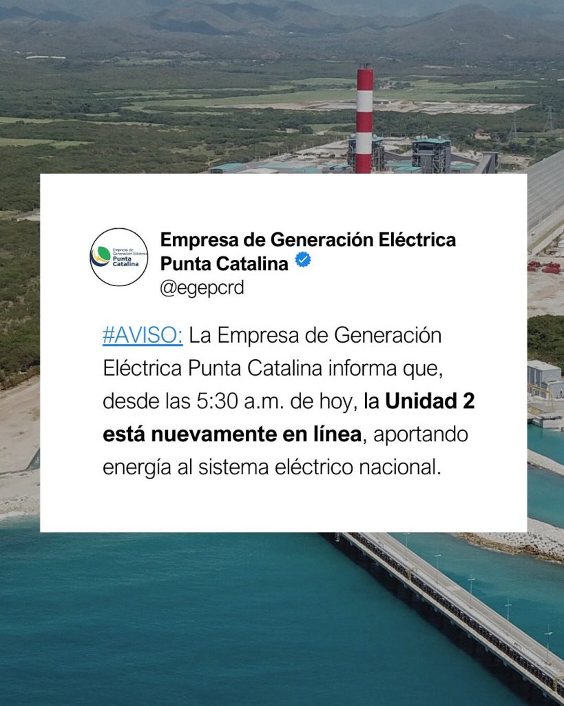 La Empresa de Generación Eléctrica Punta Catalina, anunció que la Unidad 2 de la Central Termoeléctrica Punta Catalina (CTPC) ha vuelto a estar en línea, aportando energía al sistema eléctrico nacional.