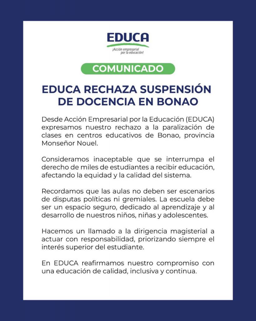Acción Empresarial por la Educación (EDUCA) rechazó este martes la paralización de clases en centros educativos del municipio de Bonao, provincia Monseñor Nouel.