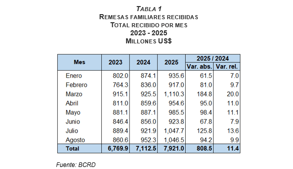 Santo Domingo, RD. – El Banco Central de la República Dominicana (BCRD) informa que, entre enero y agosto de 2025, las remesas recibidas alcanzaron la cifra de US$7,921.0 millones, aumentando US$808.5 millones (11.4 %) en comparación con el mismo período del año anterior.