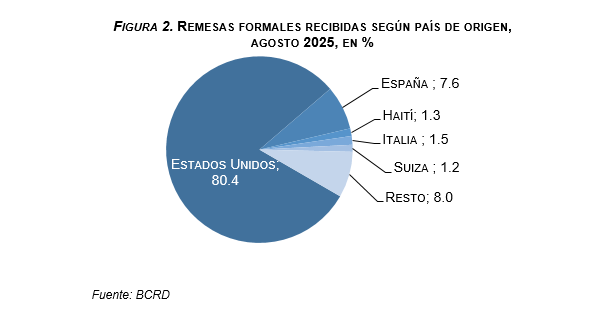 El BCRD explica que el desempeño económico de los Estados Unidos fue uno de los principales factores que incidió sobre el comportamiento de las remesas, ya que desde ese país se originó el 80.4 % de los flujos formales del mes de agosto, unos US$751.2 millones. Asimismo, el desempleo general del país norteamericano se ubicó en 4.3 % en agosto, un ligero aumento respecto al nivel de 4.2 % del pasado mes de julio de 2025, con la adición de 22,000 nuevos empleos.