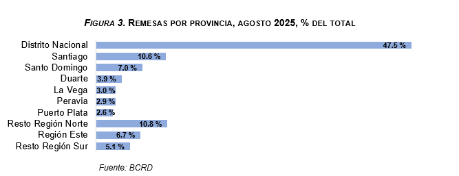 Respecto a la distribución de las remesas recibidas por provincias, el BCRD señala que el Distrito Nacional recibió una proporción del 47.5 % durante agosto, seguido por las provincias de Santiago y Santo Domingo, con un 10.6 % y 7.0 %, respectivamente. Esto indica que cerca de dos terceras partes de las remesas (65.0 %) se recibe en las zonas metropolitanas del país.