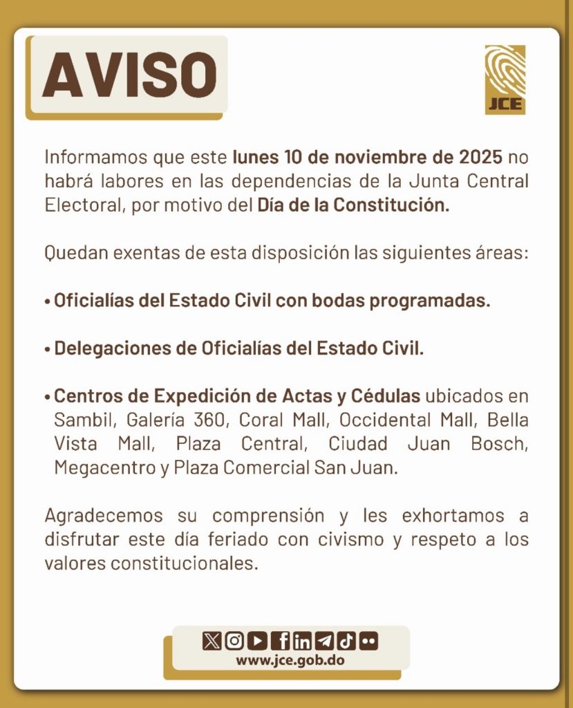 La Junta Central Electoral (JCE) informó que el próximo lunes 10 de noviembre de 2025 no habrá labores en sus dependencias a nivel nacional debido a la conmemoración del Día de la Constitución, fecha establecida como día feriado en el país.