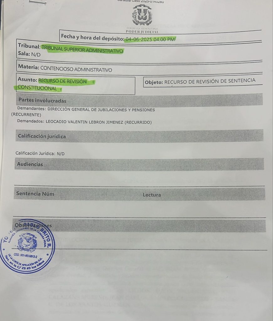 Batía dijo que dicha denuncia surge luego de que la Suprema Corte de Justicia, mediante la Sentencia Núm. SCJ-TS-25-0329, de fecha 28 de marzo de 2025, confirmara de forma firme, definitiva e irrevocable los derechos del señor Lebrón Jiménez, ordenando el reajuste y pago retroactivo de su pensión conforme a la Ley 379-81.