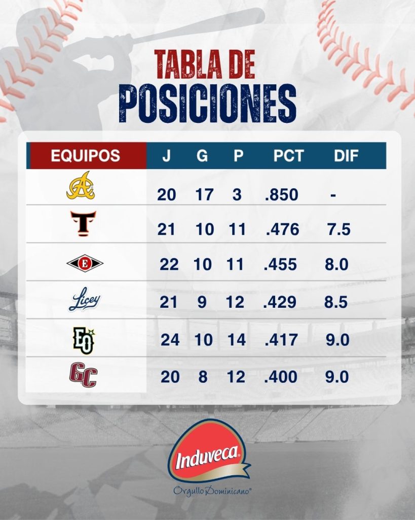 Las Águilas Cibaeñas lideran la tabla de posiciones del béisbol invernal dominicano con 17 victorias y solo 3 derrotas, manteniendo un sólido porcentaje de .850 y una cómoda ventaja sobre sus rivales.