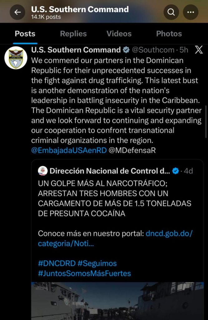 “La República Dominicana es un socio vital en materia de seguridad y esperamos continuar y ampliar nuestra cooperación para enfrentar a las organizaciones criminales transnacionales en la región”, afirmó el Southcom, resaltando incautaciones récord que multiplican por diez los volúmenes de la década anterior.