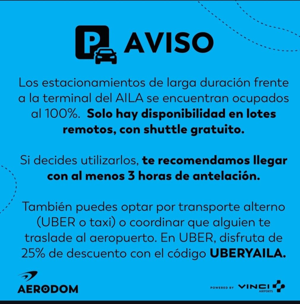La información fue dada a conocer por Aerodom, entidad que administra la terminal, la cual explicó que, ante la alta demanda, solo hay disponibilidad en los lotes remotos, los mismos cuentan con servicio de shuttle gratuito para trasladar a los viajeros hasta el edificio principal.