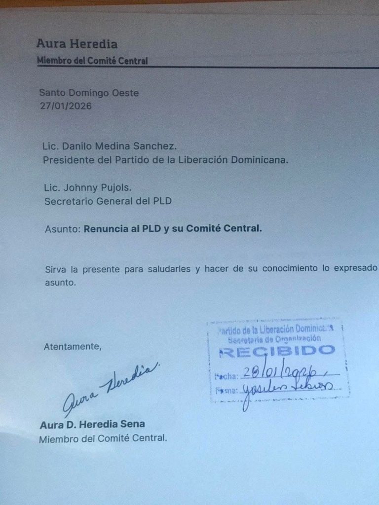 La miembro del Comité Central y ex candidata a diputada del Partido de la Liberación Dominicana, por Santo Domingo Oeste, Aura Heredia, renunció este viernes a esa organización política.
